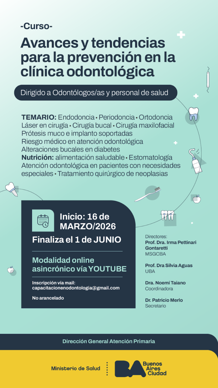 A partir del próximo lunes 16 de marzo de 2026, el Ministerio de Salud de la Ciudad de Buenos Aires, a través de la Dirección General de Atención Primaria, dará inicio al curso «Avances y Tendencias para la Prevención en la Clínica Odontológica».