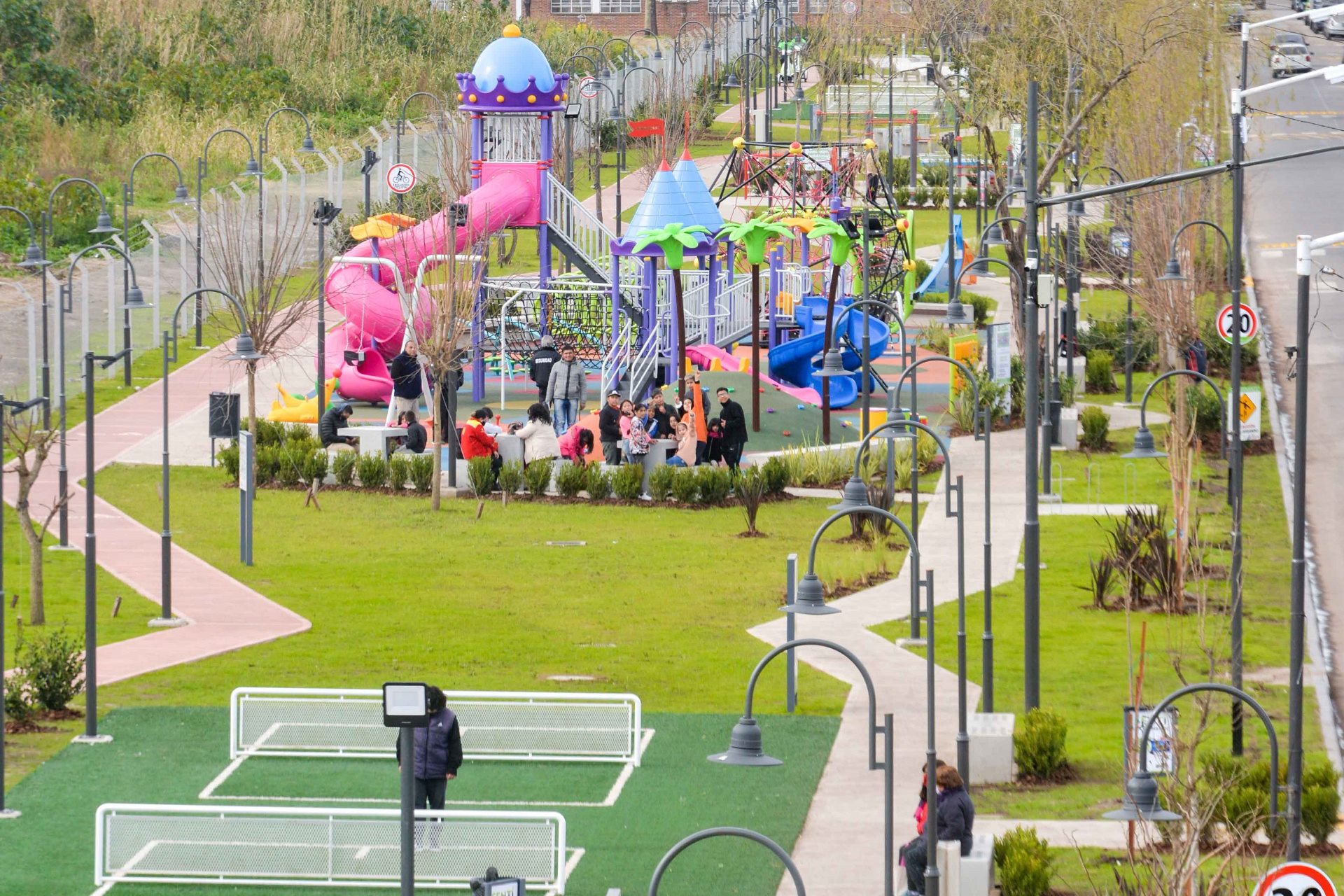 Cada sector del parque posee bancos, juegos de mesas, asientos y bebederos de hormigón premoldeado, como también cartelería informativa y cestos de residuos. A los árboles existentes se le sumaron especies autóctonas para generar más sectores de sombra, canteros con césped y un sistema de riego con rociadores. En cuanto a la seguridad, el nuevo espacio verde cuenta con iluminación LED y columnas con cámaras de vigilancia y monitoreo.
