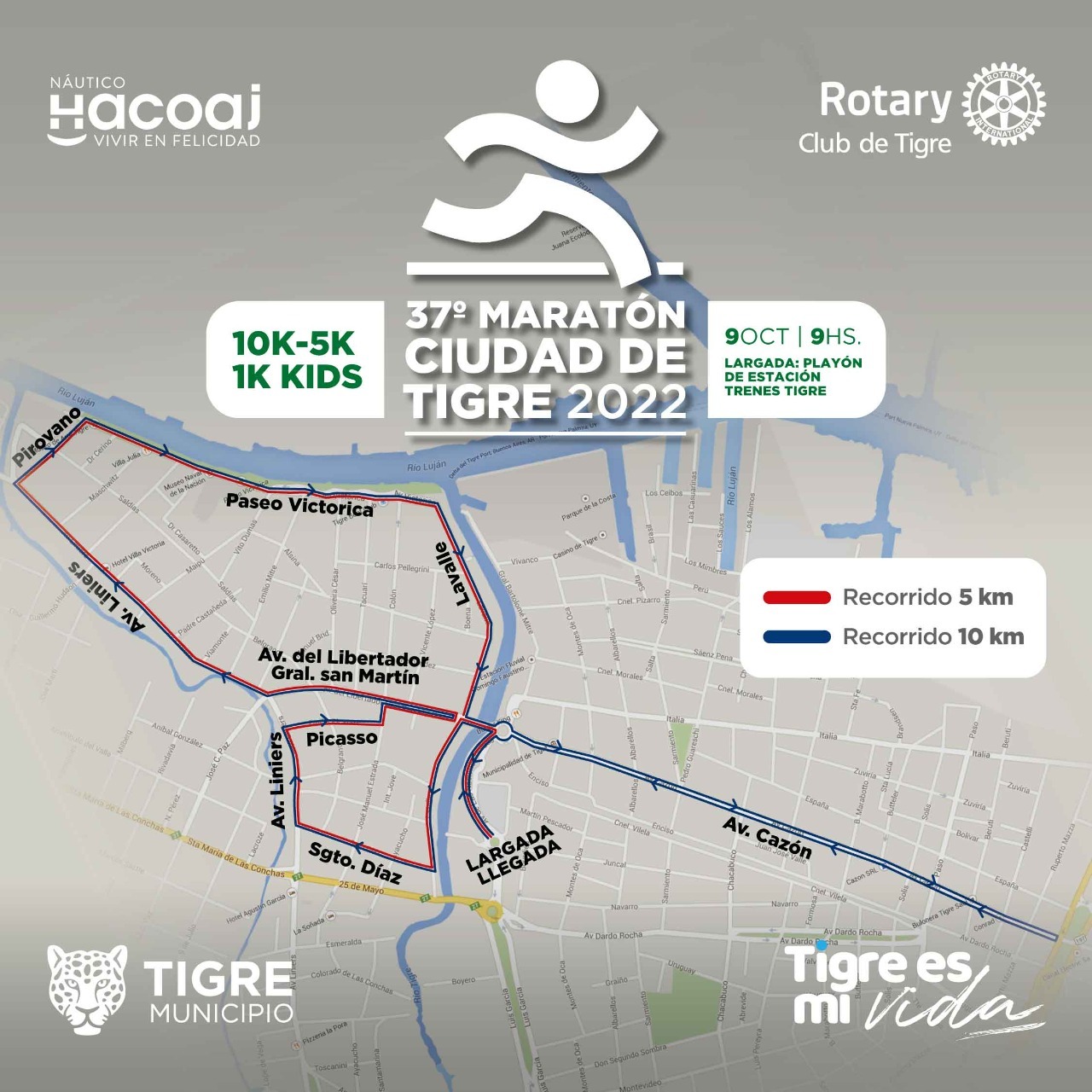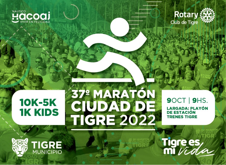 El Municipio junto al Rotary Club y el Club Náutico Hacoaj, invitan a la comunidad el domingo 9 de octubre desde las 9hs a participar en la 37° Maratón Ciudad de Tigre, que en esta edición tendrá un mensaje de sustentabilidad y de conciencia ecológica. El punto de partida será el playón de la estación de trenes del centro de la ciudad, mientras que las modalidades se dividirán en 1K Kids, 5K Aeróbica Familiar y 10K Competitiva. No se suspende en caso de lluvia.