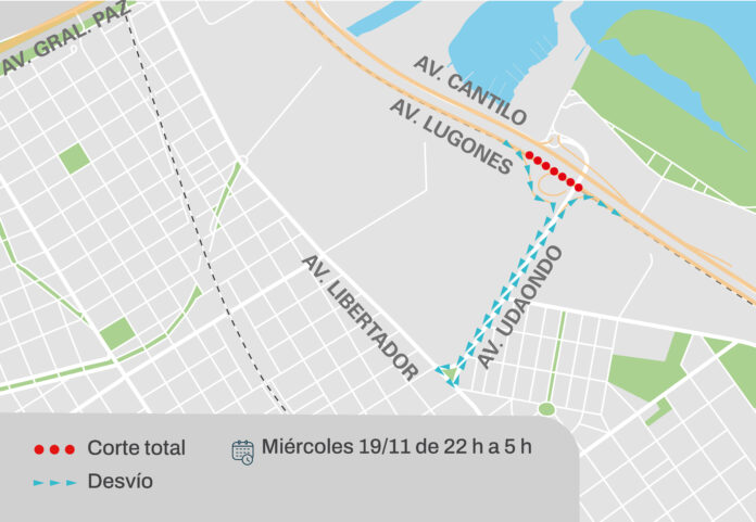 El miércoles 19 de noviembre de 22 a 5 am, se llevará adelante un corte parcial en Avenida Lugones, mano a capital. Se realiza el desvío por la salida hacia Avenida Udaondo. Los vehículos de tránsito pesado deberán circular por Avenida Libertador, hasta Udaondo, para poder volver a circular por Avenida Lugones.
