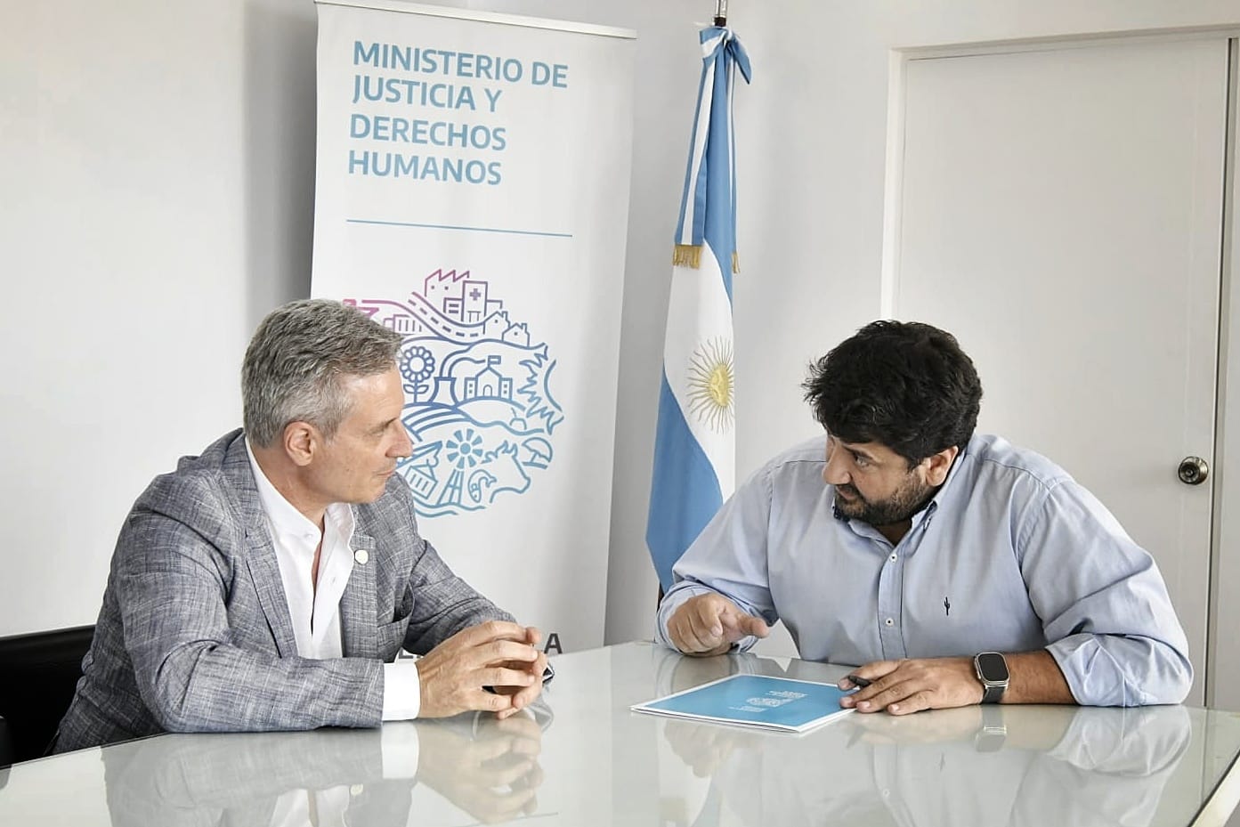 El ministro de Justicia y Derechos Humanos, Juan Martín Mena, y el presidente del Colegio de Escribanos de la provincia de Buenos Aires, Guillermo Longhui, firmaron la resolución en la que se designaron 70 escribanos y escribanas para 49 distritos bonaerenses.