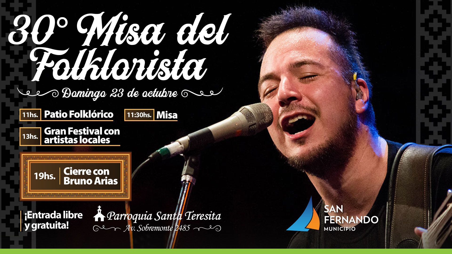 El Municipio de San Fernando invita a los vecinos a participar de la 30ª. edición de la tradicional Misa del Folklorista, que se realizará en la Parroquia Santa Teresita de Virreyes (Av. Sobremonte 2485) el domingo 23 de octubre desde las 11 horas.