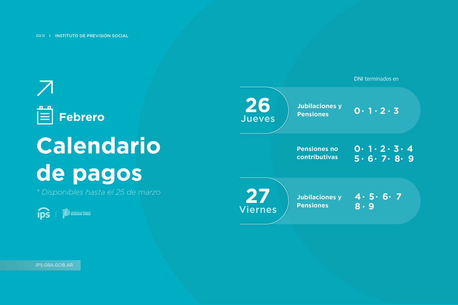 El Instituto de Previsión Social (IPS) informa que las personas jubiladas y pensionadas de la provincia de Buenos Aires percibirán los haberes del mes de febrero a partir del día jueves 26 del corriente, según cronograma que se detalla a continuación: