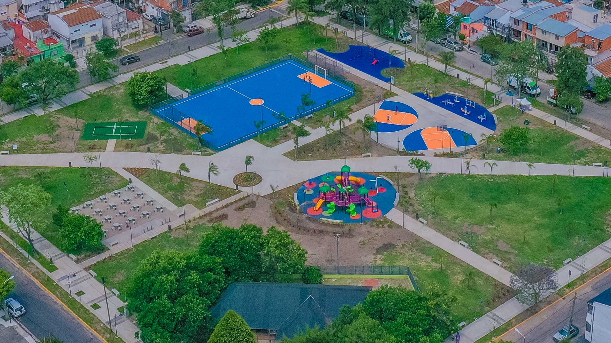 La plaza cuenta ahora con una cancha de fútbol de césped sintético que reviste un viejo playón, ahora cercado y con protecciones metálicas detrás de sus arcos; también canchas de fútbol-tenis, una de las incorporaciones más celebradas en los espacios verdes de los últimos años; canchas de básquet 3×3, un deporte de creciente popularidad; nuevos juegos infantiles de características modernas y pisos de goma antigolpes; máquinas de ejercicio aeróbico; más árboles y plantas; cámaras de seguridad; iluminación LED y mejoras en el mobiliario para su sector de descanso.