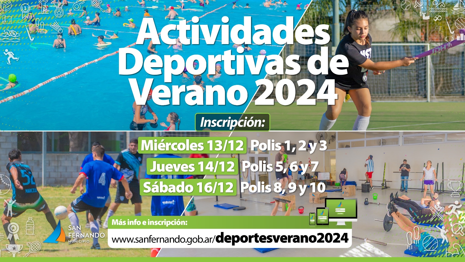 Los vecinos y vecinas de la ciudad ya se pueden anotar para disfrutar las mejores actividades deportivas de piletas, campo y salón del Municipio en la web www.sanfernando.gob.ar/deportesverano2024 o acercándose a los Polideportivos. Durante enero y febrero se desarrollarán actividades como yoga, ritmos latinos, gimnasia, fútbol, hockey, natación, pileta libre y mucho más, en turnos separados a las Colonias.