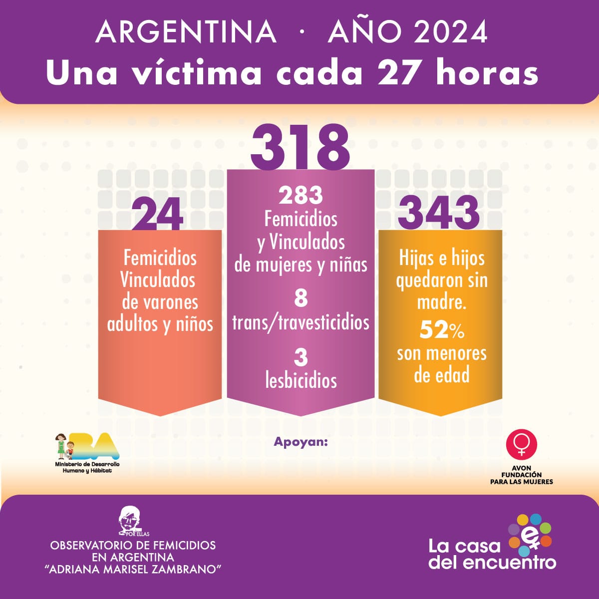 Con el apoyo de Fundación Avon y el Ministerio de Desarrollo Humano y Hábitat del GCBA, la Casa del Encuentro visibiliza información clave sobre los femicidios, crímenes de odio y femicidios vinculados en Argentina del 1 de enero al 31 de diciembre del 2024