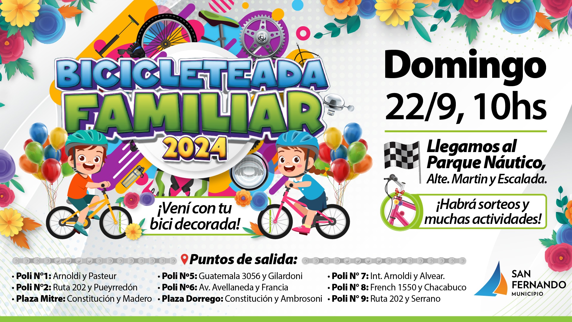 El Municipio, a través de su Secretaría de Deporte, vuelve a lanzar una divertida propuesta al aire libre para toda la familia con el fin de celebrar la primavera, con una nueva edición de la Bicicleteada Familiar este domingo 22 de septiembre, desde las 10h saliendo desde distintos barrios y finalizando el recorrido en el Parque Náutico de Almirante Martin y Escalada.