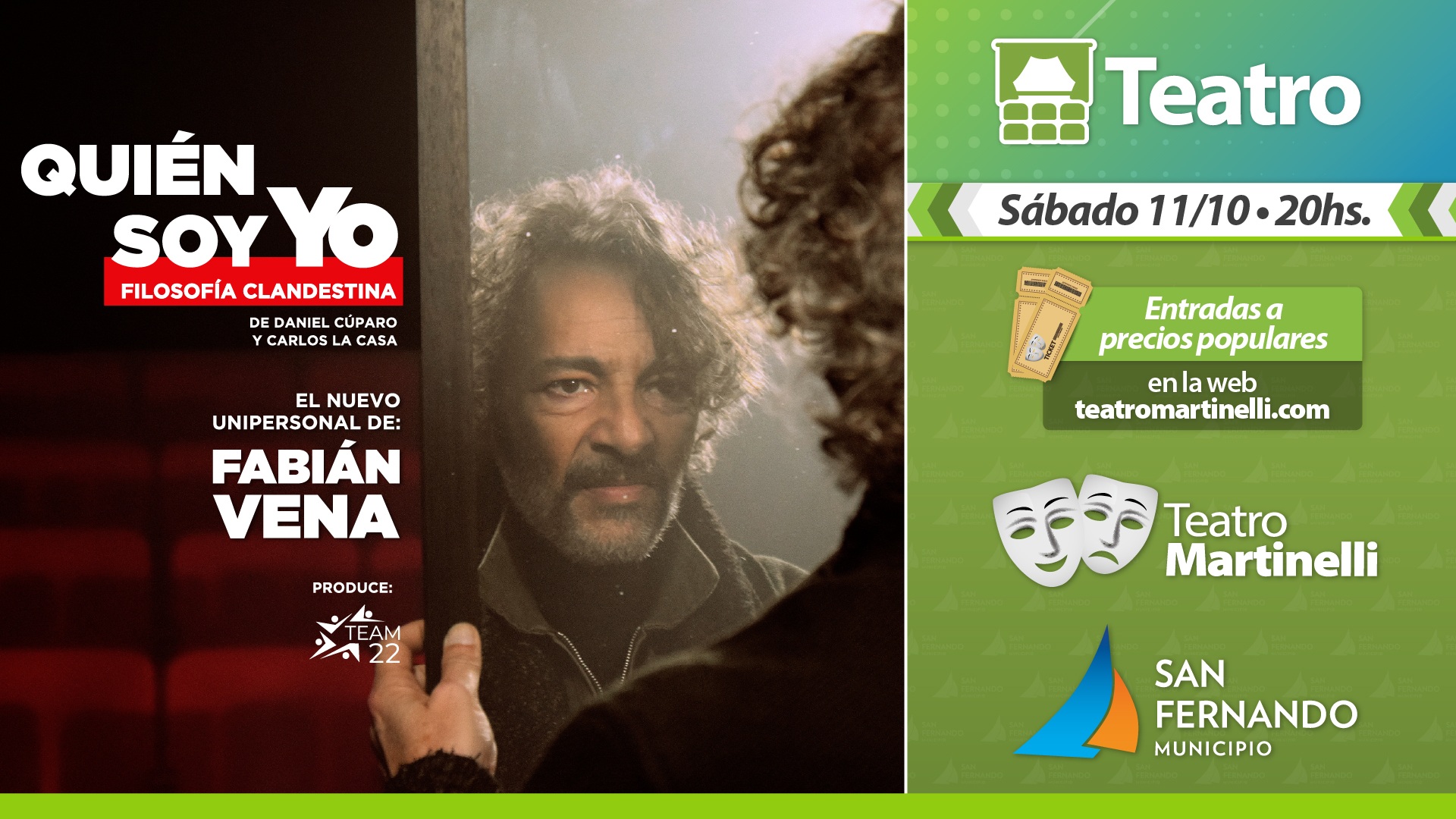 El sábado 11 a las 20h, en el Teatro Martinelli, se presentará el reconocido actor argentino Fabián Vena, regresa a escena con su unipersonal “Quien soy yo: Filosofía Clandestina”, en el que personificará a un profesor de Filosofía que, tras ser expulsado de la universidad, decide continuar su vocación en el anonimato, donde encuentra su verdadera voz.