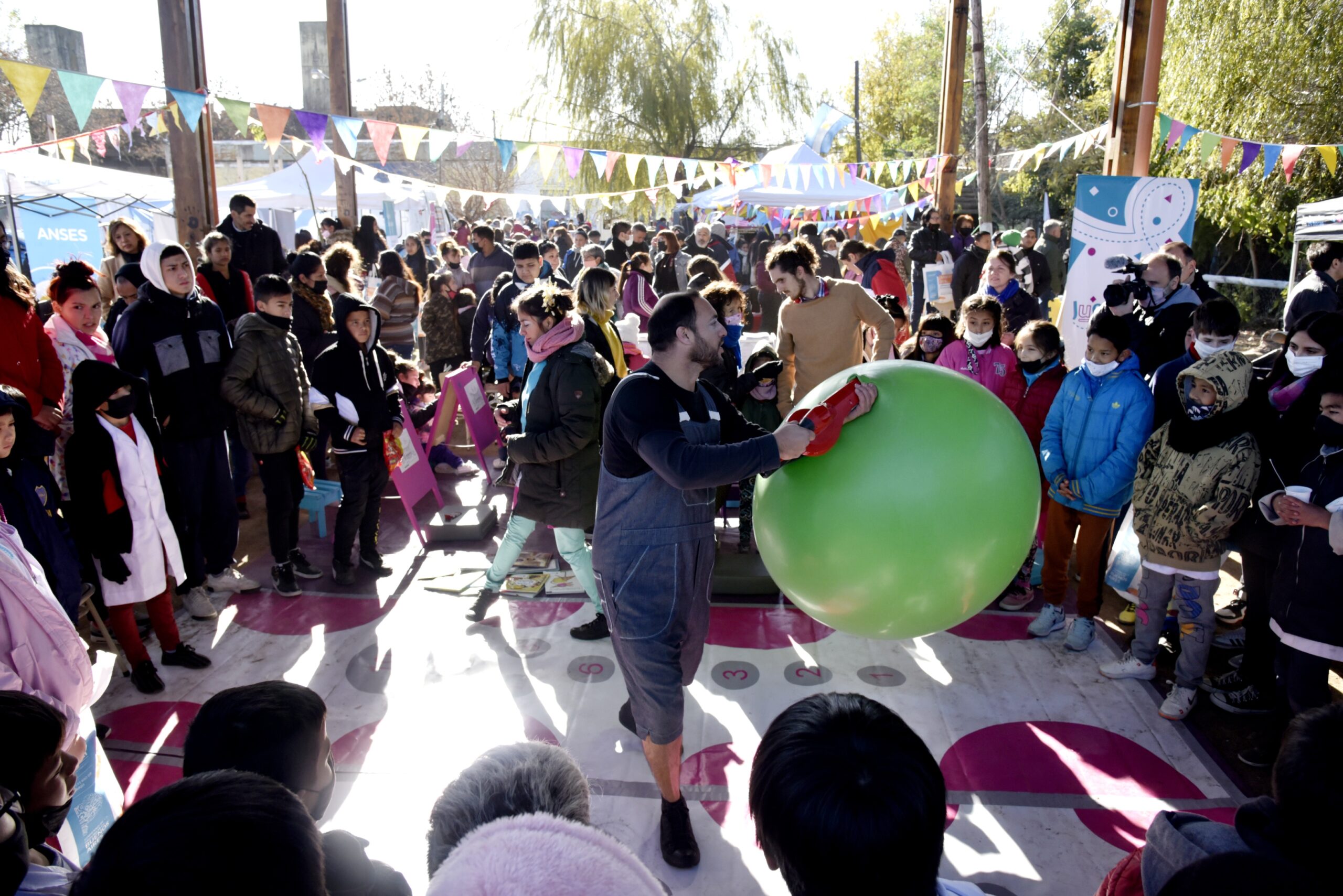 La “kermés por infancias y adolescencias plenas y cuidadas” incluyó juegos, una radio abierta para niñas y niños, circo, pintada de murales, carpas de vacunación antigripal y contra el Covid-19, además de postas del espacio Juventudes, ANSES, Empleo Joven y acceso al DNI para las familias del barrio.