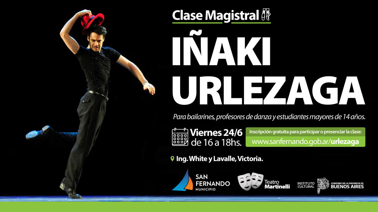 La Dirección de Cultura de San Fernando tiene el honor de invitar a vecinas y vecinos a participar y disfrutar de una imperdible clase magistral a cargo del mundialmente reconocido bailarín, coreógrafo y director Iñaki Urlezaga, uno de los máximos exponentes argentinos de la danza. Se presentará el viernes 24 de junio de 16 a 18hs, con entrada gratuita mediante reserva previa, en el Teatro Julio Martinelli de Ingeniero White y Lavalle, localidad de Victoria.