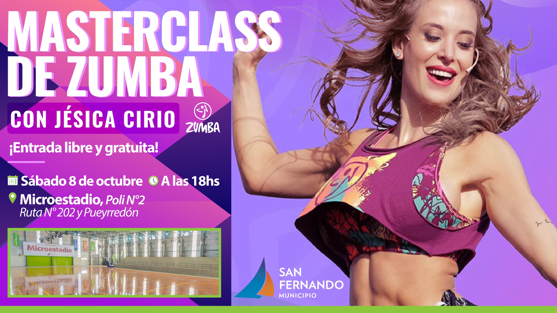 El sábado 8 de octubre a las 18hs, Jésica Cirio visitará San Fernando para encabezar una clase de Zumba muy completa y entretenida en el nuevo y súper preparado Microestadio del Polideportivo N°2, ubicado sobre la Ruta 202, entre Pueyrredón y Balcarce.