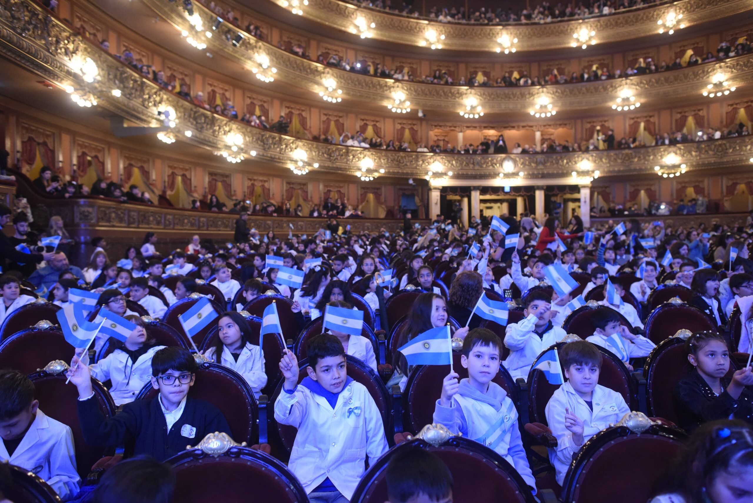 “Hoy es un día de muchas emociones, en un lugar increíble como lo es este Teatro Colón. Frente a esta bandera que unió a todo el sistema que busca un mismo objetivo: seguir aprendiendo. En eso vamos a estar poniendo mucho nuestro foco, no sólo en el aprendizaje de los niños sino de todo el sistema”, dijo Jorge Macri, quien estuvo acompañado por la ministra de Educación, Mercedes Miguel.