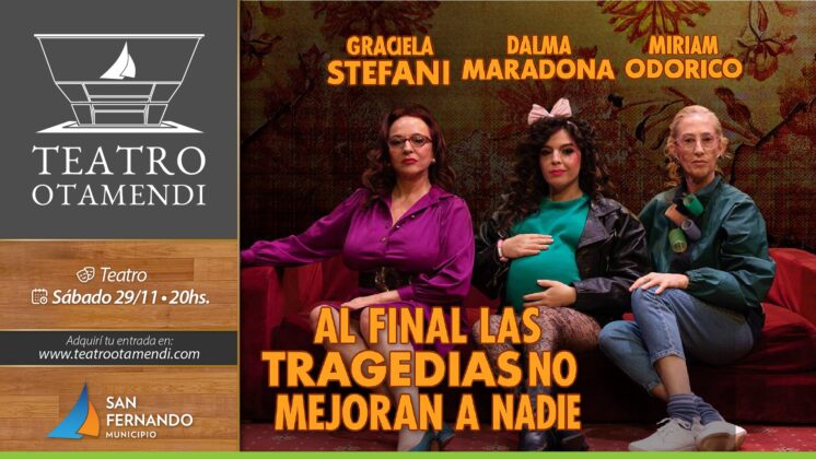 El 29/11 a las 20h aterriza “Al final las tragedias no mejoran a nadie”, con dramaturgia y dirección de Julieta Cayetina. El elenco está integrado por Dalma Maradona, Miriam Odorico y Graciela Stefani. El relato sigue a Berta y Luisa, dos viudas que sobreviven entre chismes, entierros y partidas de canasta. Mientras aún atraviesan el duelo, heredan un viejo hotel rutero en decadencia. La impensada llegada de Cecilia, una joven embarazada decidida a todo para poder dar a luz, las empuja a tomar decisiones que desafían sus propios prejuicios.