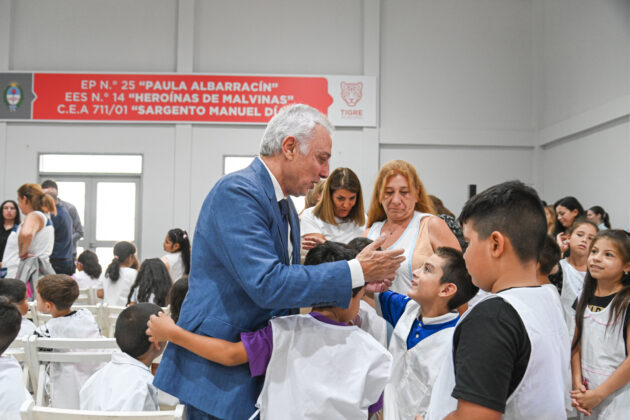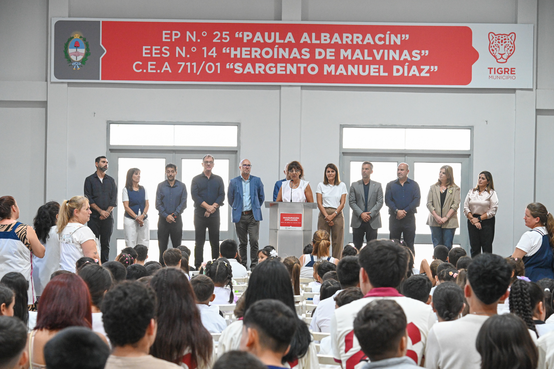 En un acto significativo para la comunidad educativa, el intendente de Tigre, Julio Zamora, y la secretaria de Desarrollo Social y Políticas de Inclusión, Gisela Zamora, encabezaron el acto de inauguración de la ampliación de la Escuela de Educación Primaria N.° 25 “Paula Albarracín”, la Escuela de Educación Secundaria N.° 14 “Heroínas de Malvinas” y el Centro de Educación de Adultos N.° 711/01 “Sargento Manuel Díaz”; instituciones que comparten edificio y cumplen un rol fundamental en la formación de niños, jóvenes y adultos del distrito.