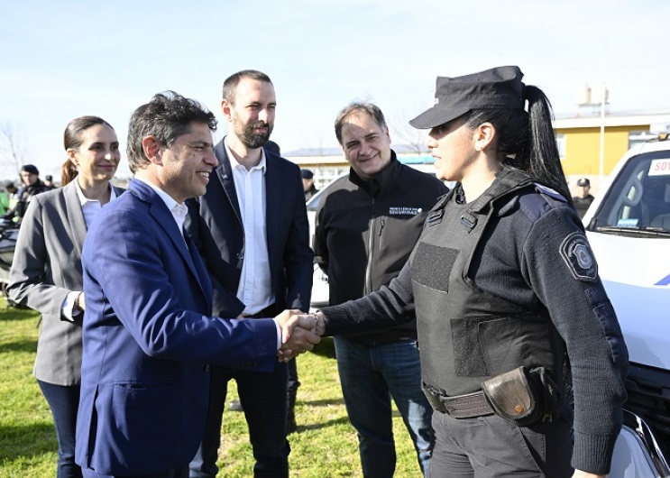 El gobernador de la provincia de Buenos Aires, Axel Kicillof, encabezó este martes el acto de entrega de nuevos móviles policiales para fortalecer la prevención del delito en el municipio de Hurlingham. Fue junto al ministro de Seguridad, Javier Alonso; de Infraestructura y Servicios Públicos, Gabriel Katopodis; el intendente local, Damián Selci; y la jefa de gabinete municipal, Florencia Lampreabe.