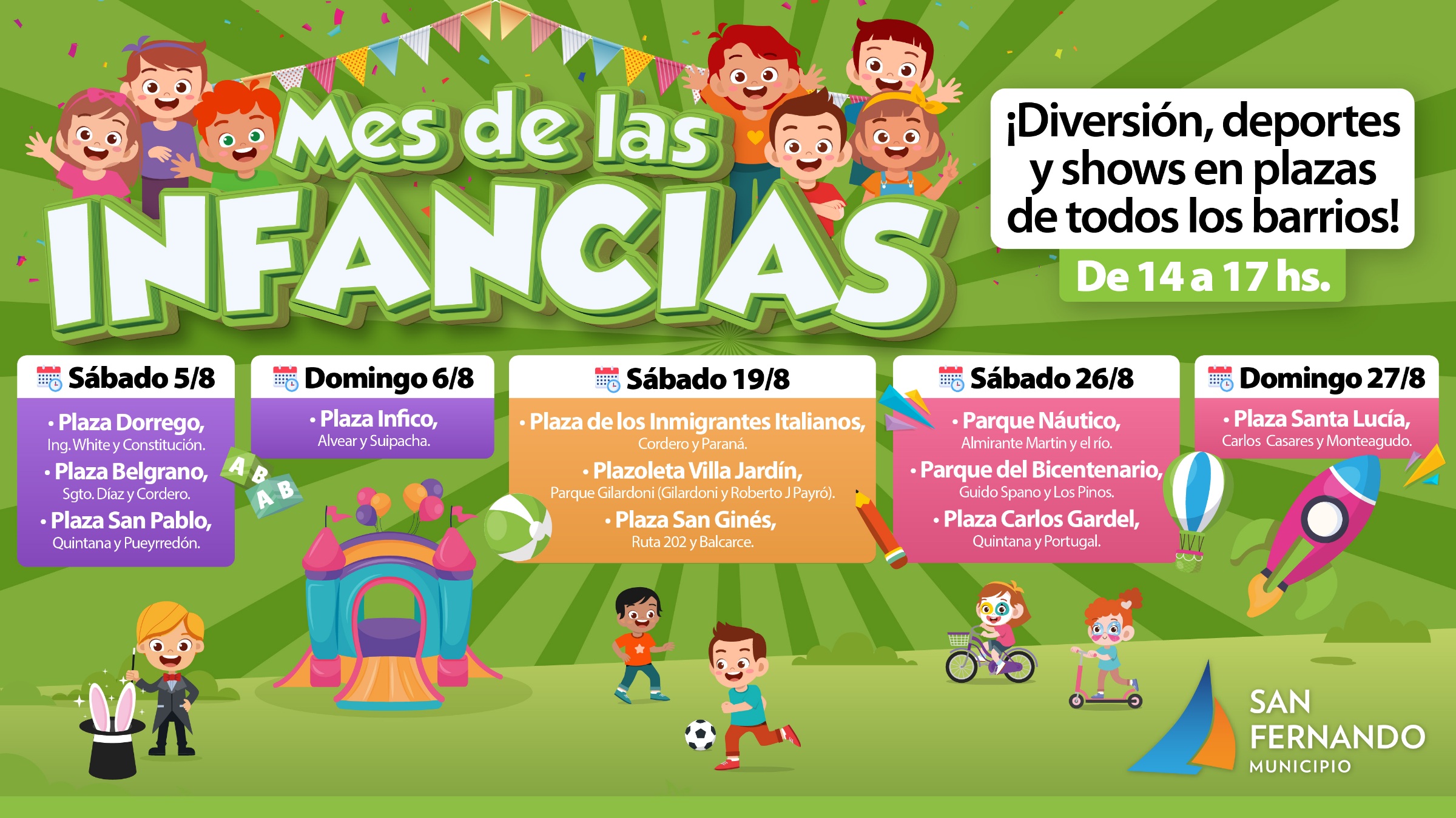 En el marco del Mes de las Infancias, el Municipio invita a las vecinas y vecinos a disfrutar en familia las tardes más lindas y divertidas en las plazas y parques de San Fernando los sábados 5, 19 y 26 y domingos 6 y 27 de agosto de 14 a 17 horas, totalmente gratis.