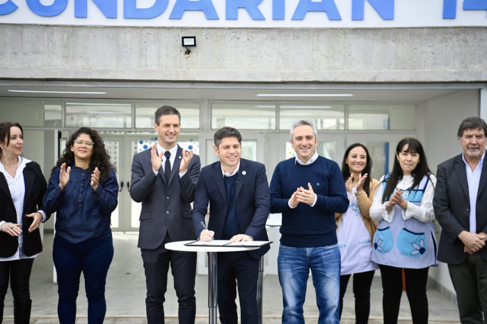 El gobernador de la Provincia de Buenos Aires, Axel Kicillof, el ministro de Desarrollo de la Comunidad, Andrés Larroque, y el intendente de San Vicente, Nicolás Mantegazza, firmaron un convenio para la construcción de un playón deportivo triple en el barrio Alejandro Korn Centro, en el marco de la inauguración de un nuevo polo educativo provincial en el distrito.