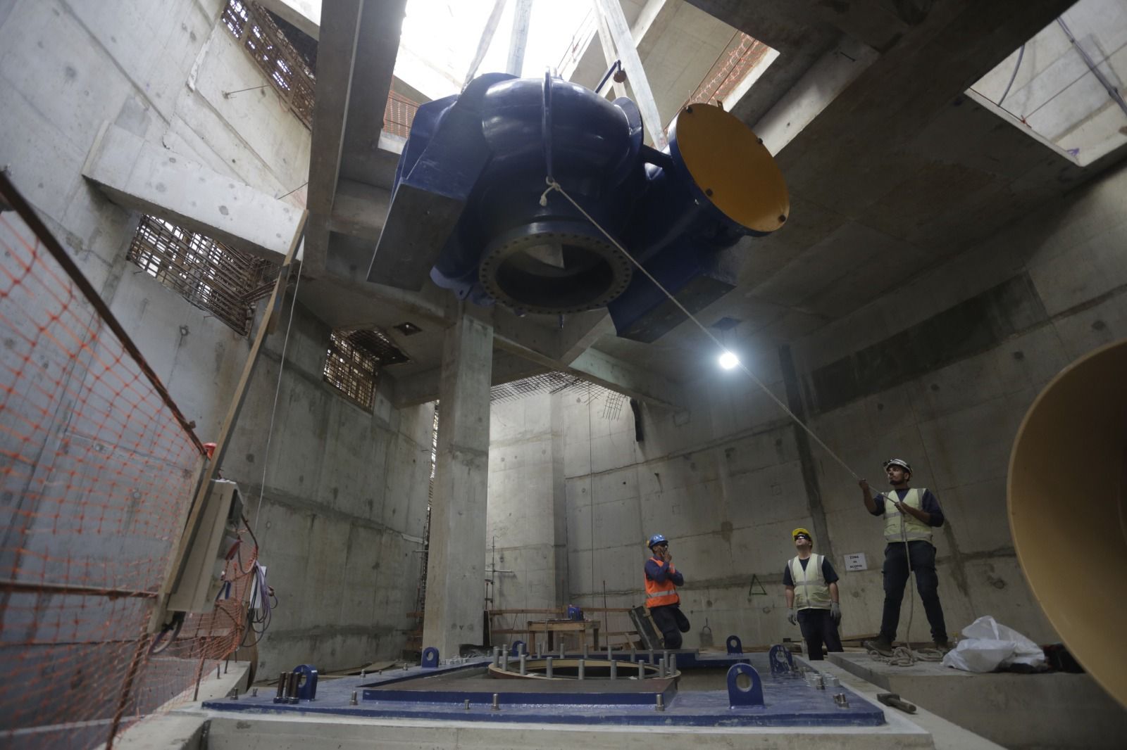 De estas electrobombas, cada una con capacidad para bombear 4,5 m3/s, 8 se instalarán a 27 metros de profundidad en la Estación Elevadora de Entrada y serán las responsables de elevar el líquido cloacal que llega a través de los mega colectores al predio del Dock Sud. Por otro lado, las otras bombas restantes se encontrarán al final del proceso, en la Estación de Bombeo de Salida y serán las encargadas de impulsar el líquido pretratado a través del Emisario, asegurando de que siempre haya líquido saliendo por los risers o rosetas difusoras, a 12 Km de la costa del Río de La Plata.