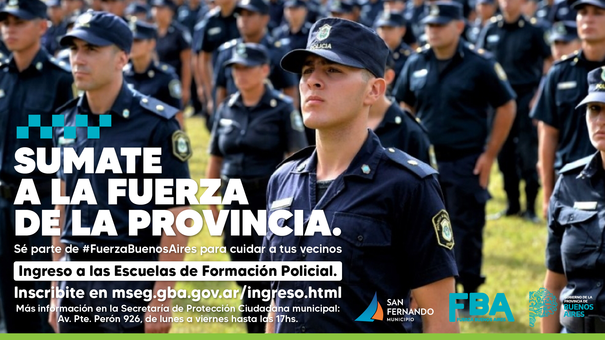 Continúa abierta la inscripción para sanfernandinas y sanfernandinos que aspiren a ingresar a las Escuelas de Formación Policial. Para más información sobre esta convocatoria general, concurrir a la Secretaría de Protección Ciudadana del Municipio – Av. Pte. Perón 926, de lunes a viernes de 8 a 17 hs. o consultar en https://www.mseg.gba.gov.ar/ingreso.html