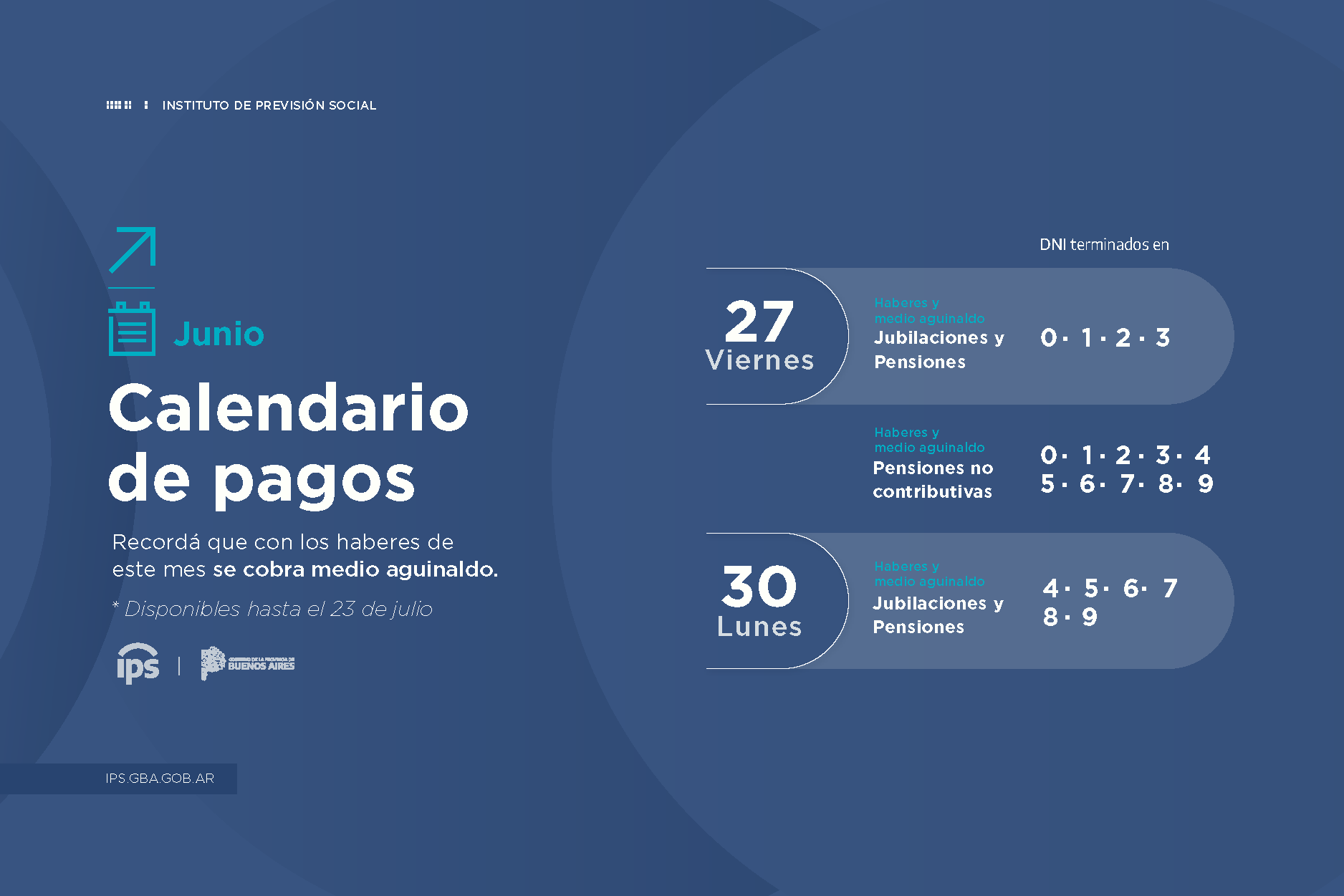 El Instituto de Previsión Social (IPS) informa que, hoy lunes 30, continúa el pago de medio aguinaldo -SAC Proporcional- junto a los haberes de junio, para las personas jubiladas y pensionadas de la provincia de Buenos Aires, según cronograma que se detalla a continuación: