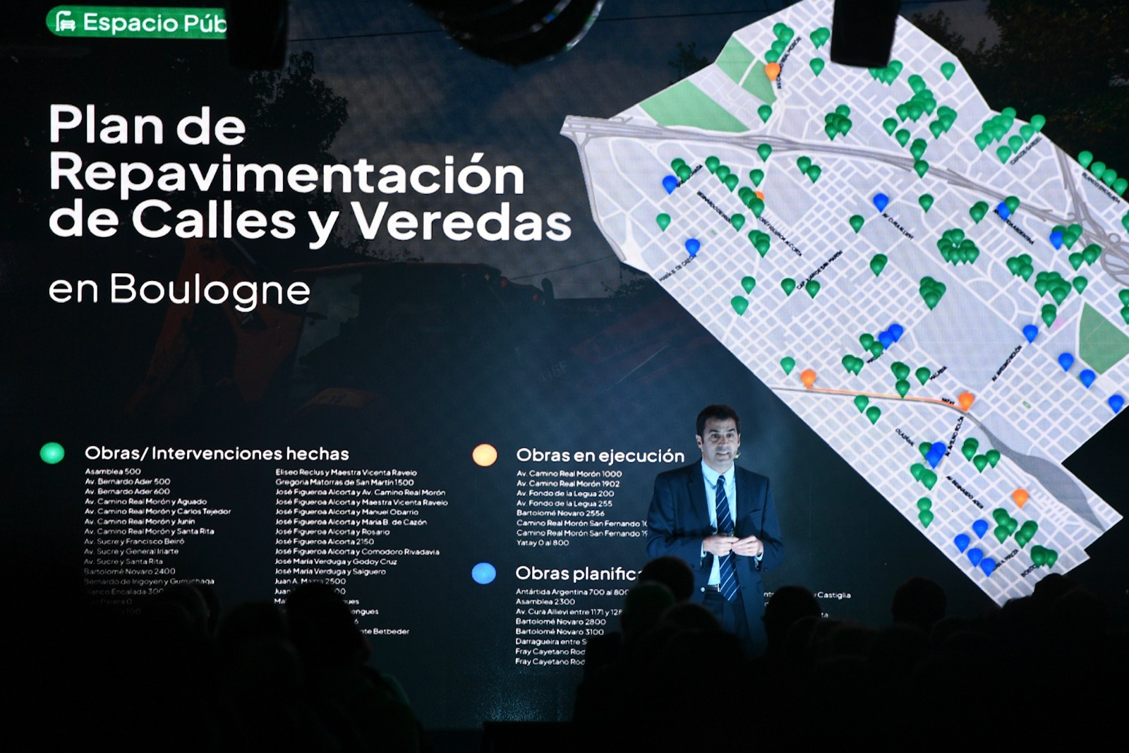 En relación al Espacio Público y Urbanismo, Lanús anunció que comenzó la obra del Parque Público Ipiranga (22 m de ancho, 600 m de largo), con bulevar, bicisenda, áreas verdes, juegos y descanso. El Plan de Reparación de Calles y Veredas avanza en Boulogne con más de 30 intervenciones, 8 en ejecución y 15 planificadas (ej.: Antártida Argentina 700-800, Av. Cura Allievi 1171-1280). Se plantarán 4,200 árboles, se realizarán 6,500 podas, se repararán 500 veredas y se instalarán 3,000 contenedores, optimizando recolección de basura y barrido digitalizado.