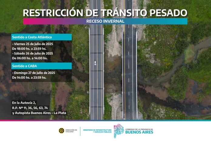 La Dirección de Vialidad de la Provincia de Buenos Aires, dependiente del Ministerio de Infraestructura y Servicios Públicos, comunica que -debido al inicio del receso invernal- los días viernes 25, sábado 26 y domingo 27 de julio de 2025 se restringirá la circulación de camiones con carga de más de 7 (siete) toneladas de porte bruto en la Autovía 2, las Rutas Provinciales Nº11, Nº36, Nº56, Nº63, Nº74, y la Autopista Buenos Aires–La Plata, con el objetivo de facilitar el desplazamiento vehicular y prevenir siniestros de tránsito en rutas turísticas.