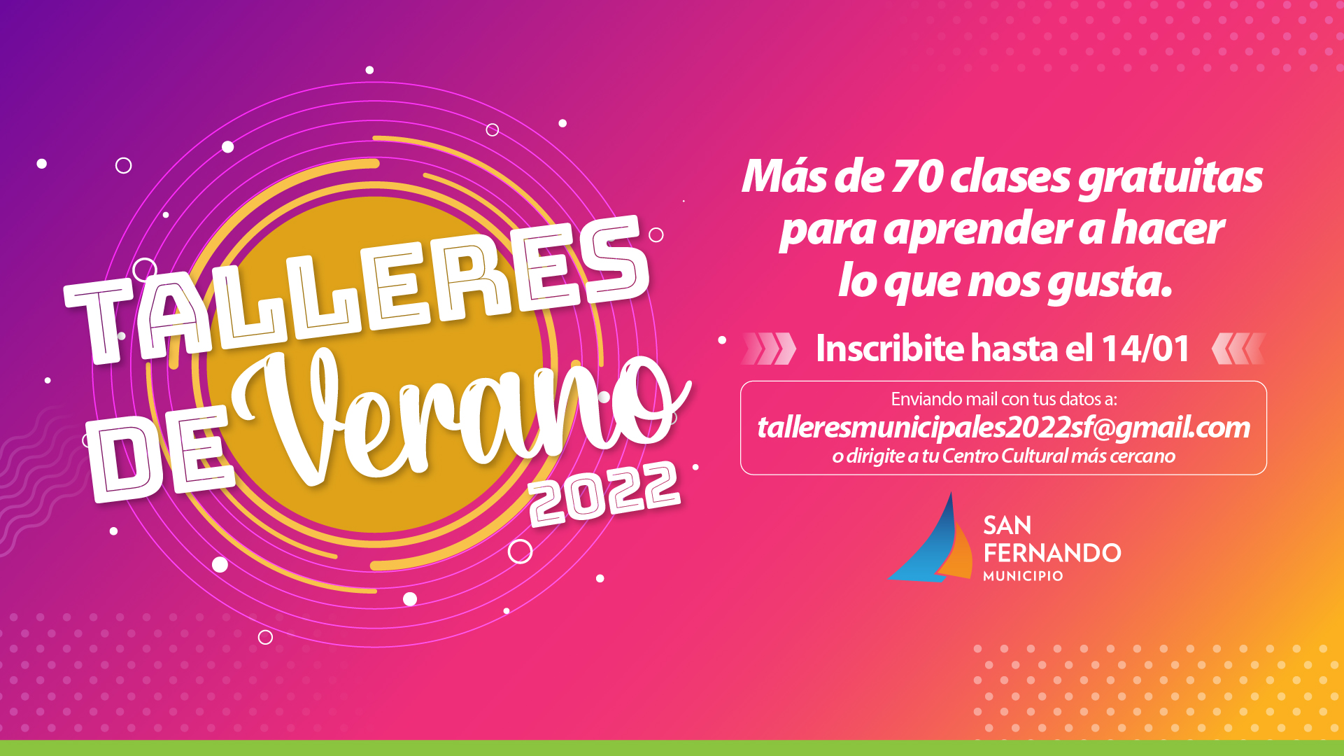 Hasta el 14 de enero, se podrán anotar vecinas y vecinos por mail a talleresmunicipales2022sf@gmail.com o dirigiéndose los Centros Culturales los días hábiles de 10 a 16hs. El Municipio ofrece más de 70 actividades que iniciarán el lunes 17 de enero, como tango, guitarra, cocina, panadería, peluquería, manicuría, yoga, corte y confección, ksokedamas, zumba. y muchas más. Más información en www.sanfernando.gob.ar/talleresdeverano.