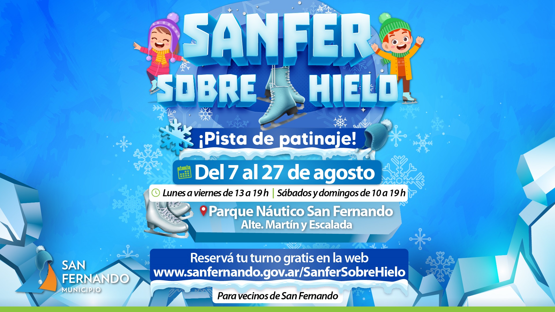 La Secretaría de Deportes del Municipio de San Fernando invita a una actividad sumamente especial por primera vez en la ciudad: una alucinante Pista de Patinaje sobre Hielo instalada en el Parque Náutico (Alte. Martin y Escalada, junto al río) para disfrutar del lunes 7 al domingo 27 de agosto. Para utilizarla, los vecinos sanfernandinos -de forma exclusiva- podrán reservar turnos totalmente gratis en la web www.sanfernando.gob.ar/sanfersobrehielo indicando talles de los patines, datos de contacto y número de DNI que se requerirá en el ingreso.