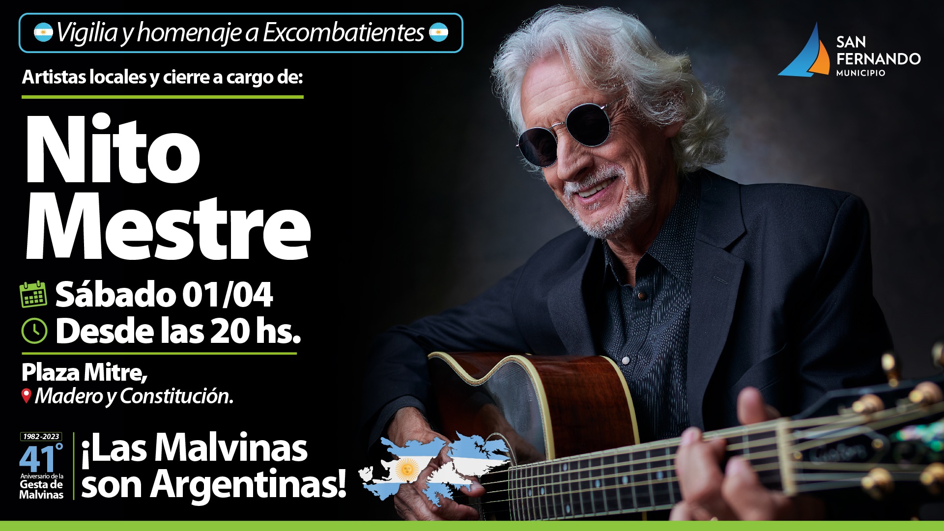 En vísperas del Día del Veterano de Guerra y Caídos en Malvinas, para recordar y homenajear a sus Héroes contemporáneos, el Municipio de San Fernando organizó el sábado 1 de abril a partir de las 20h en la plaza Mitre (Madero y Constitución) una Vigilia y show musical de artistas locales con un gran cierre a cargo de Nito Mestre.