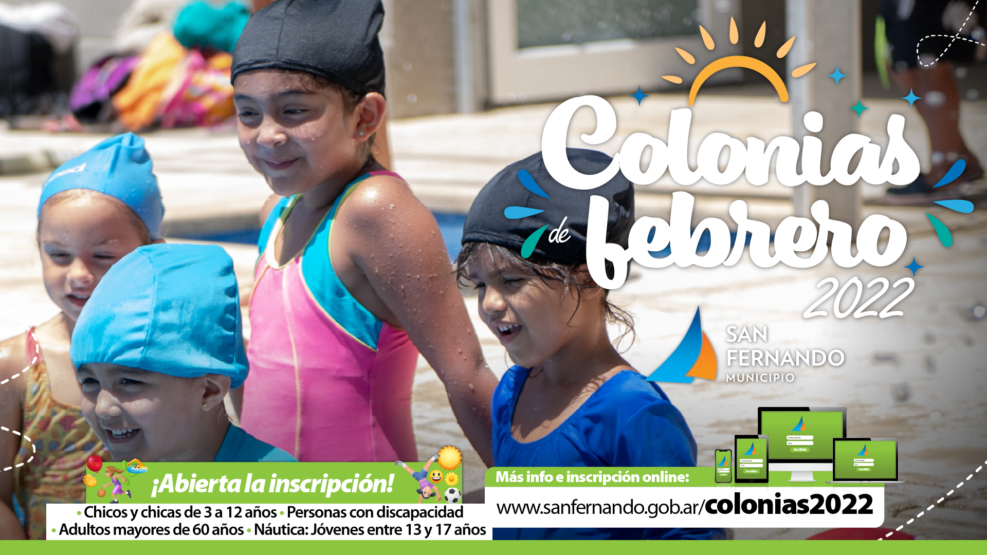 Ya comenzó la inscripción digital en www.sanfernando.gob.ar/Colonias2022 o presencial en los Polideportivos municipales. Podrán anotarse chicas y chicos de 3 a 12 años, adultos mayores de 60, personas con discapacidad y jóvenes de entre 13 y 17 años de la Colonia Náutica. Desde el 1 hasta el 18 de febrero, San Fernando tendrá la mejor temporada de piletas y actividades al aire libre.