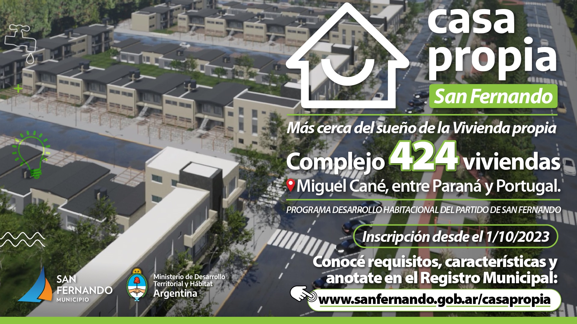 Con el trabajo en conjunto del Municipio y el Ministerio de Desarrollo Territorial y Hábitat avanza muy rápido un complejo de 424 hogares del “Programa Desarrollo Habitacional del Partido de San Fernando”. El 1 de octubre comenzará la inscripción y a partir de diciembre se anunciará la fecha del primer sorteo. Sus requisitos y toda la información se encuentran en www.sanfernando.gob.ar/casapropia