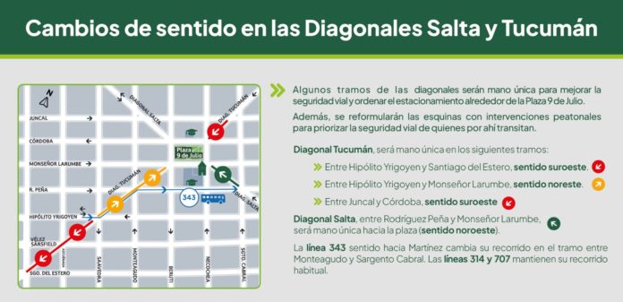 Para mejorar la seguridad vial y ordenar el estacionamiento alrededor de la Plaza 9 de Julio, algunos tramos de las calles Diagonal Tucumán y Diagonal Salta cambiaron a mano única. Además, se reformularon las esquinas con intervenciones peatonales para priorizar la seguridad vial de peatones y conductores.