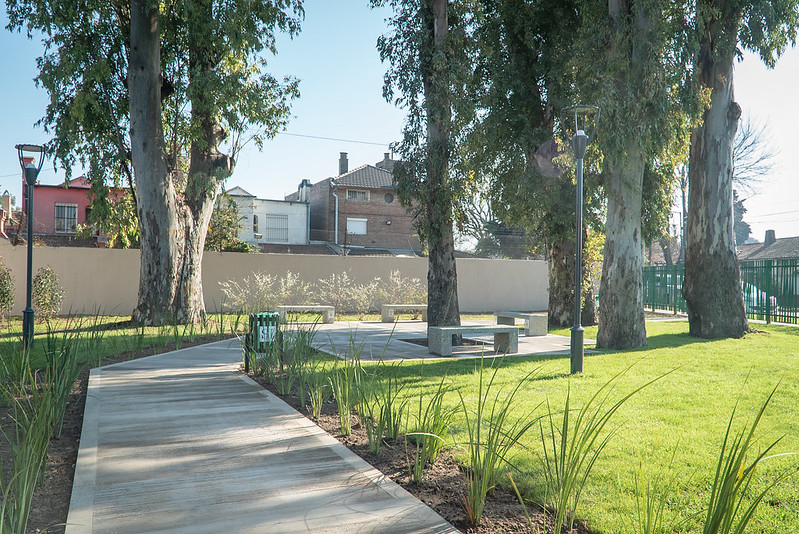 La gente de este barrio, conocido por sus grandes arboledas, ya disfruta de un nuevo paseo público y sustentable con bancos de vidrio recuperado y reciclado de botellas que aportan los vecinos.