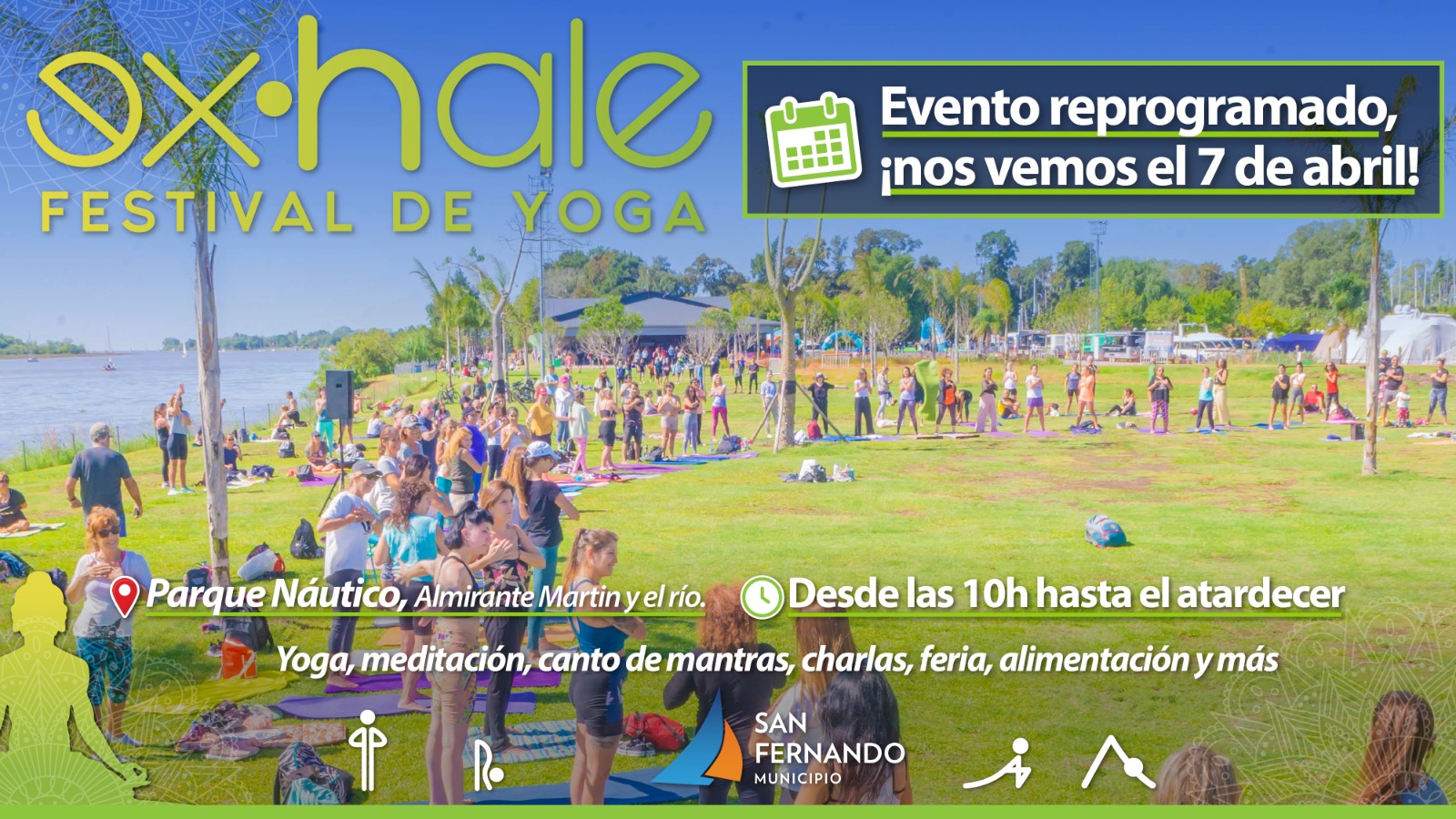El Municipio de San Fernando invita al Festival de Yoga “Exhale”, que reprograma su fecha por mantenimiento del centro de exposiciones del Parque Náutico donde será realizado, finalmente, el domingo 7 de abril de 10 a 19h, con entrada libre y gratuita en Almirante Martin y el río.