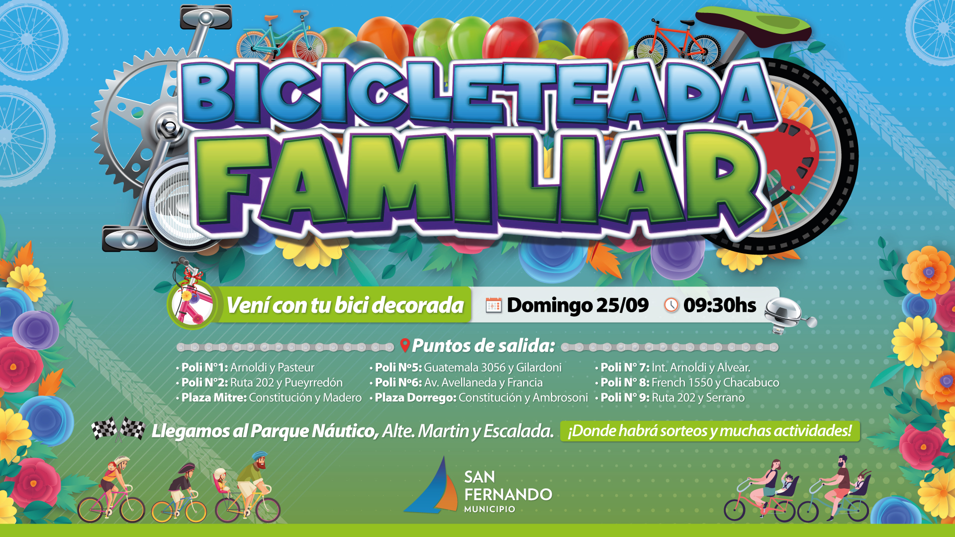 El Municipio de San Fernando, a través de su Secretaría de Deporte, vuelve a lanzar una divertida propuesta al aire libre para toda la familia con el fin de celebrar la primavera. Llega una nueva edición de la Bicicleteada Familiar este domingo 25 de septiembre, desde las 9:30hs saliendo de 9 puntos distintos, finalizando el recorrido en el Parque Náutico, ubicado en Almirante Martín y Escalada.