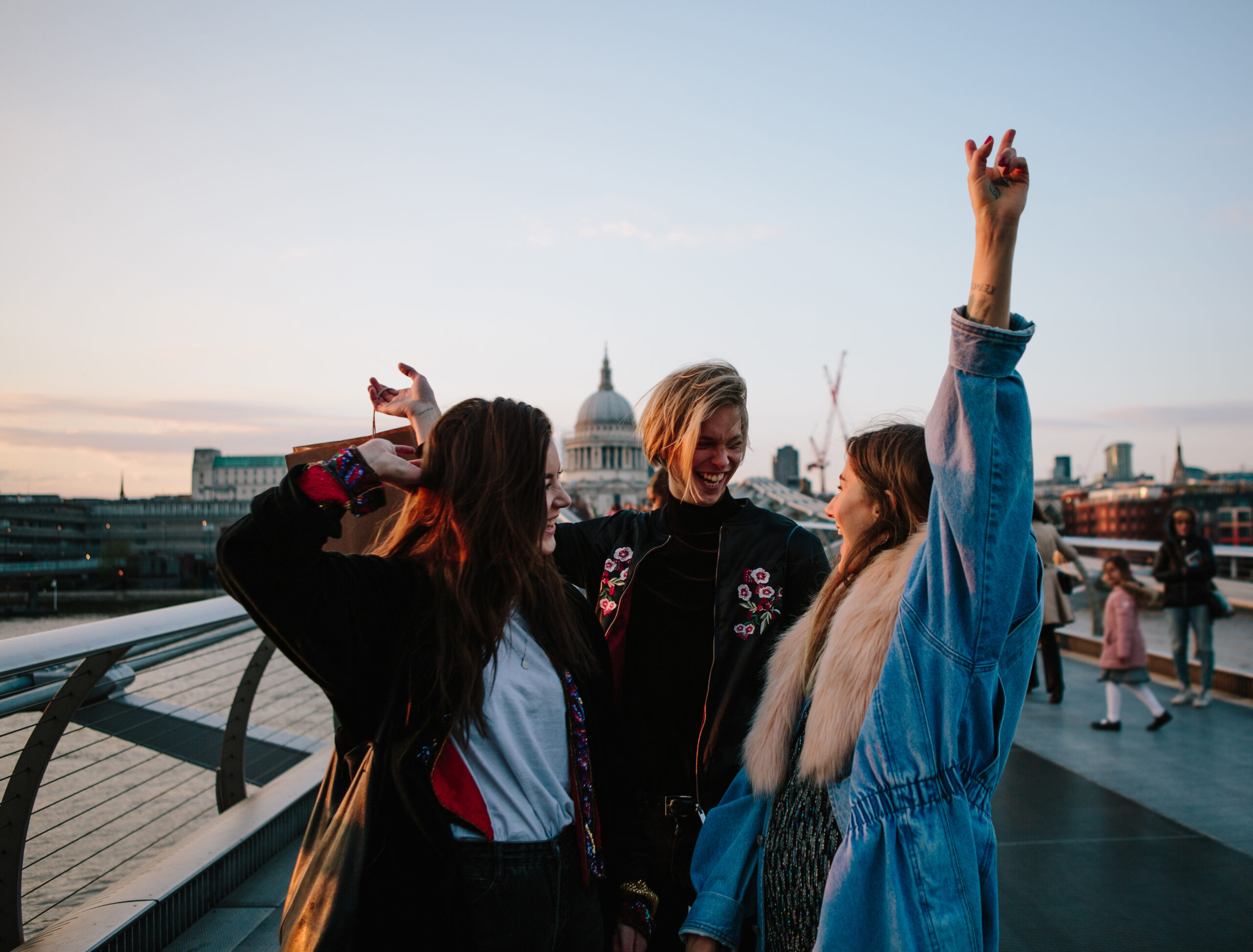Group of young cool twenties friends exploring London and the river thames, taking photos and enjoying themselves