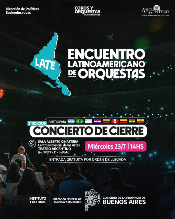Este miércoles 23 de julio a las 14 hs. se llevará a cabo el cierre del 2º Encuentro Latinoamericano de Orquestas “LATE 2025”, con 300 jóvenes músicas y músicos de Argentina y otros ocho países de la región, en la Sala Ginastera del Teatro Argentino de La Plata.
