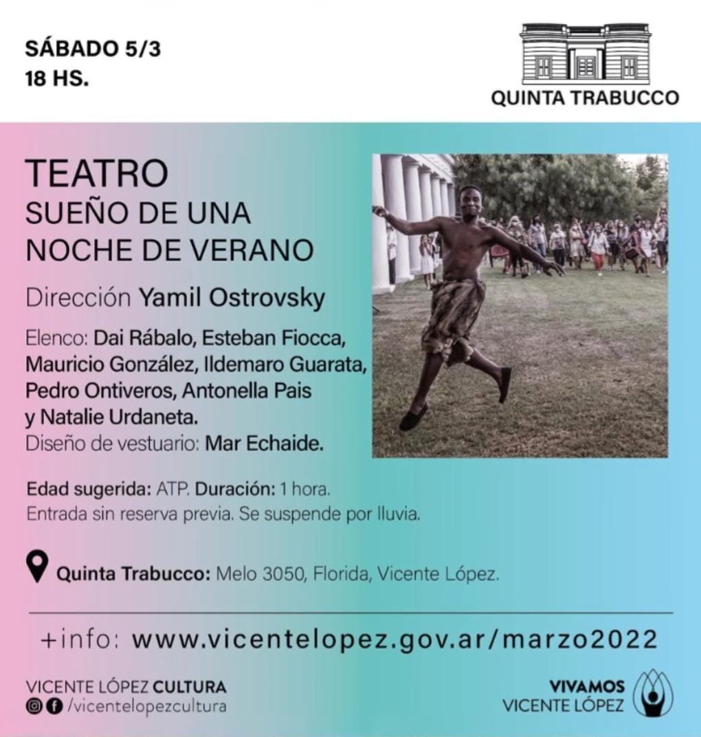 Este sábado 5 de marzo a las 18 horas se realizará una puesta en escena de “Sueño de una noche de verano”, el clásico de William Shakespeare, en Quinta Trabucco (Melo 3050, Florida).